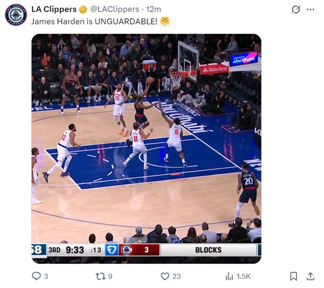第三節(jié)哈登6中2+三分2中1+罰球4中4拿到9分1籃板3助攻1搶斷,三節(jié)打完21分8助攻3籃板2搶斷,而倫納德第三節(jié)只拿到4分,三節(jié)打完25分1籃板1助攻,快船已經被尼克斯反超。