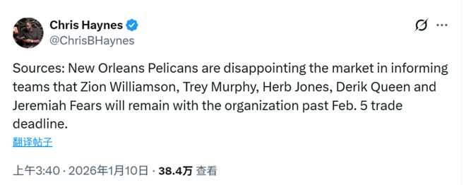 北京時間1月10日,據名記Haynes報道,新奧爾良鵜鶘隊已向聯盟其他球隊明確表示,在2月6日交易截止日(北京時間)前,無意交易錫安-威廉姆森、特雷-墨菲、赫伯特-瓊斯、德里克-奎因和耶利米-費爾斯。