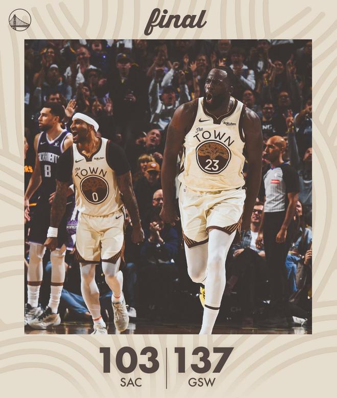 德羅贊高位跳投得分,波杰姆斯基暴扣,隨后3罰全中,勇士轟出了23比8的攻勢,取得28分領(lǐng)先。施羅德2罰全中,理查德回敬遠(yuǎn)投,威少、穆迪各有上籃得分。威少連續(xù)失誤,希爾德、波斯特相繼遠(yuǎn)投得分,距離終場不足2分30秒,勇士領(lǐng)先35分鎖定勝局。兩隊開始在場上練兵,時間逐漸走完。最終,勇士以137比103完勝國王。薩克拉門托單節(jié)19比40落后。