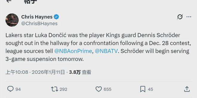 施羅德被禁賽將從明天對陣火箭開始,三場比賽讓他損失29.2萬美元。大家對這筆罰單有兩個疑問:1、兩周前的比賽,為啥現在才公布處罰結果?2、施羅德想毆打的湖人球員是誰?Chris Haynes補充報道,這個湖人球員是東契奇!
