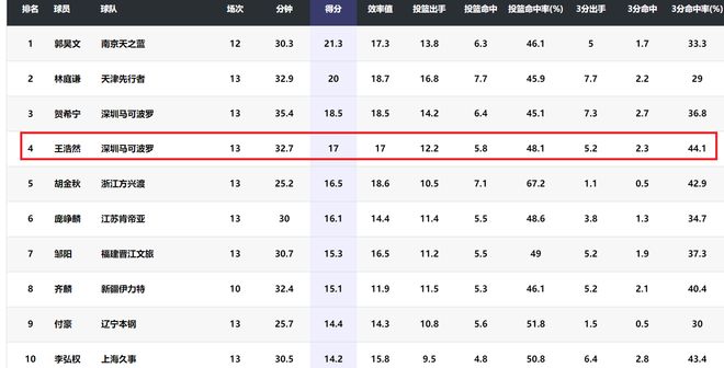 王浩然儼然成為非常穩定的三分射手。在本賽季的本土球員得分榜上,王浩然排名第四,僅落后郭昊文、林庭謙和賀希寧。王浩然的得分甚至比胡金秋、周琦、曾凡博等國家隊的名將還高。和他們相比,王浩然還有一手產量頗高的出色的三分球。很顯然,王浩然非常值得一個全明星席位,也非常值得進入中國男籃集訓,總比經常進入集訓名單的杜潤旺、劉禮嘉出色。