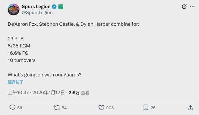 北京時間1月12日,NBA常規賽:馬刺103-104不敵森林狼。此役過后,馬刺27勝12負依然西部第二。森林狼26勝14負西部第四,領先第五湖人1個勝場。馬刺今天輸球,三后衛必須背鍋,這哥仨投籃合計35中8,出現10次失誤。