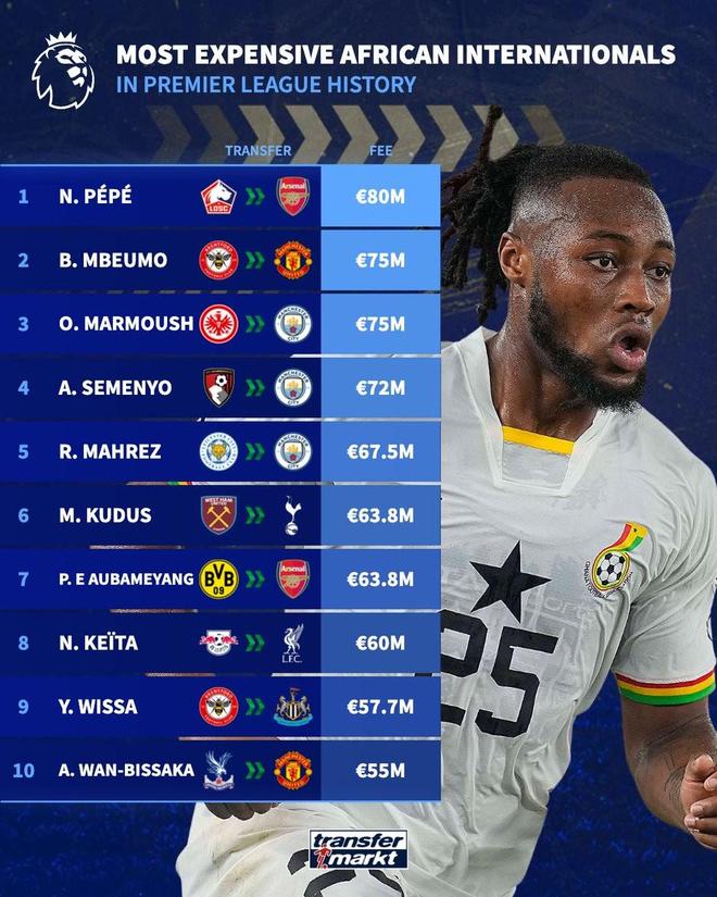 曼城從伯恩茅斯簽下加納前鋒塞門約,據悉轉會費為7200萬歐,據德轉統計,塞門約是英超歷史上轉會費第四高的非洲國腳。