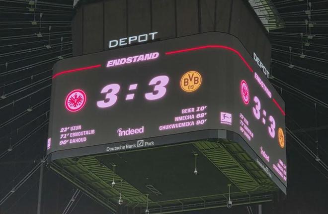 凌晨三點半的德意志銀行公園球場,當達胡德在92分鐘的抽射劃破夜空,法蘭克福球迷的歡呼幾乎要掀翻看臺;可僅僅三分鐘后,丘庫埃梅卡的一腳推射,又讓主場的喜悅瞬間凝固。3-3,這場德甲第16輪的巔峰對決,用最極致的反轉演繹了足球的魅力,也為法蘭克福這支常年被“遺憾”籠罩的球隊,刻下了一道兼具悲情與微光的印記。